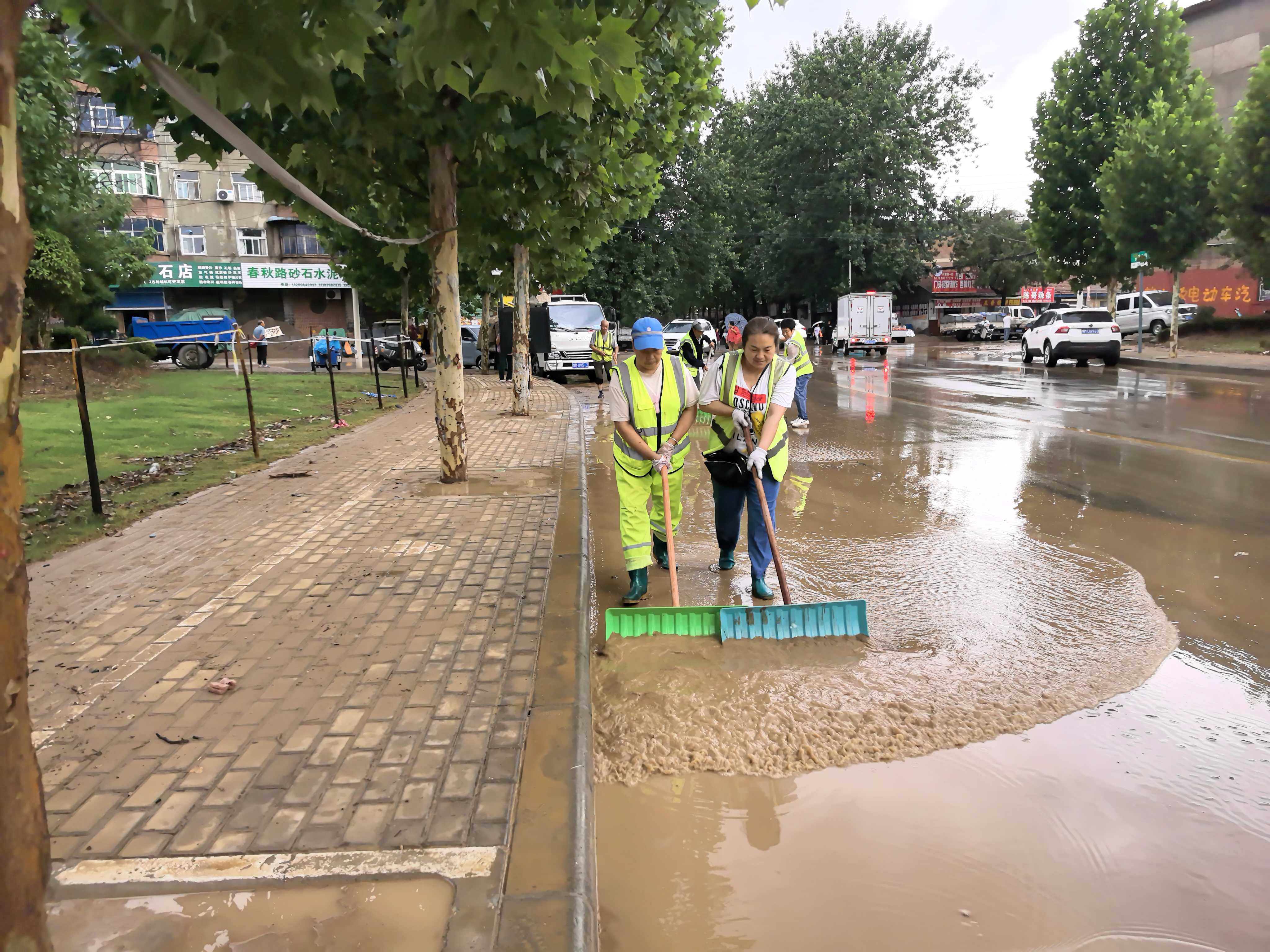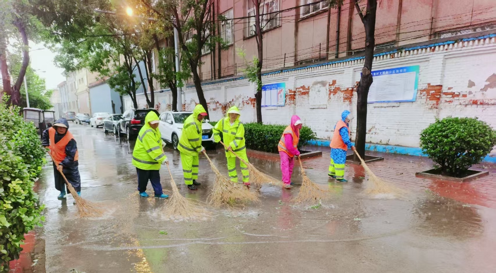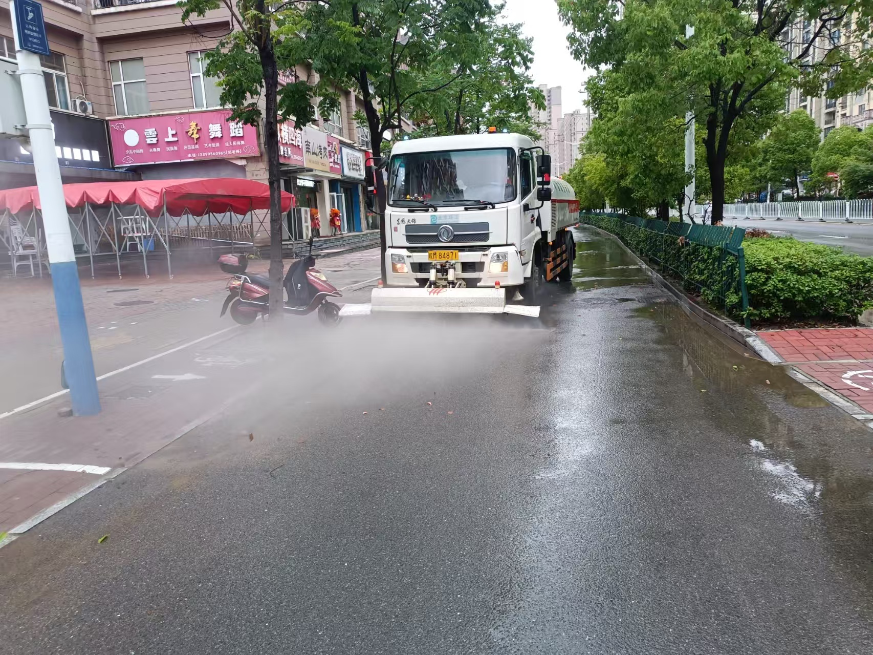 降雨期间,公司对城区主次干道、背街小巷、人行道等区域实施全方位动态保洁,管理人员下沉一线巡查,主要采取“机械冲洗+人工保洁”作业模式,力争最短时间内恢复道路原貌。降雨过后,出动大型洗扫车等车辆,加大路面冲洗力度,彻底清除积水和污垢;保洁人员对路牙及雨水箅子周边积水进行推水作业,减少积水对市民出行的影响。
