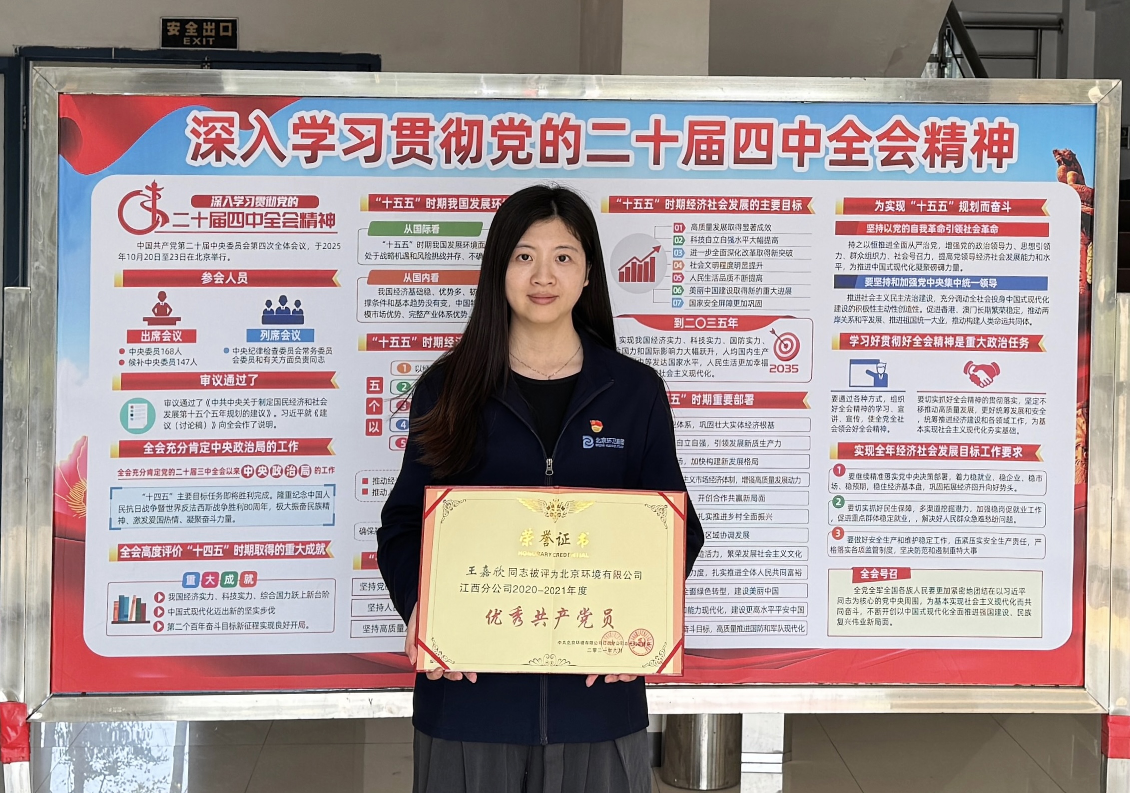 王嘉欣,女,中共党员,1989年8月出生,2016年4月加入江门京环环保科技有限公司,现任江门京环环保科技有限公司综合办公室负责人、工会副主席。作为一名基层青年党员干部,她始终以“一名党员就是一面旗帜”的标准严格要求自己,将对党的忠诚融入日常、化为行动,在行政管理、人力资源、食堂保障和工会工作中默默耕耘、倾情奉献。2021年和2022年,她分别荣获北京环境有限公司江西分公司“优秀共产党员”称号。